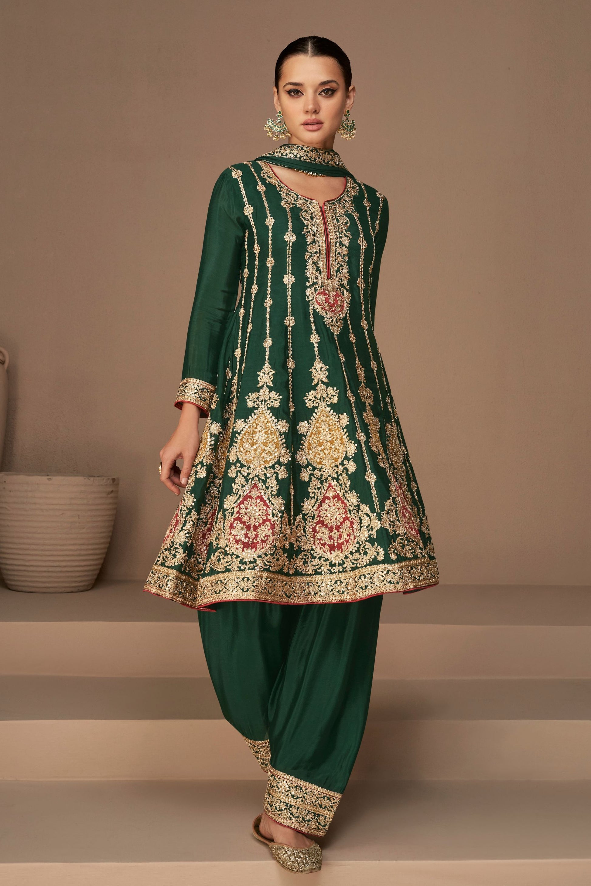 Green Chinon Silk salwar suit - Thread Embroidery Work