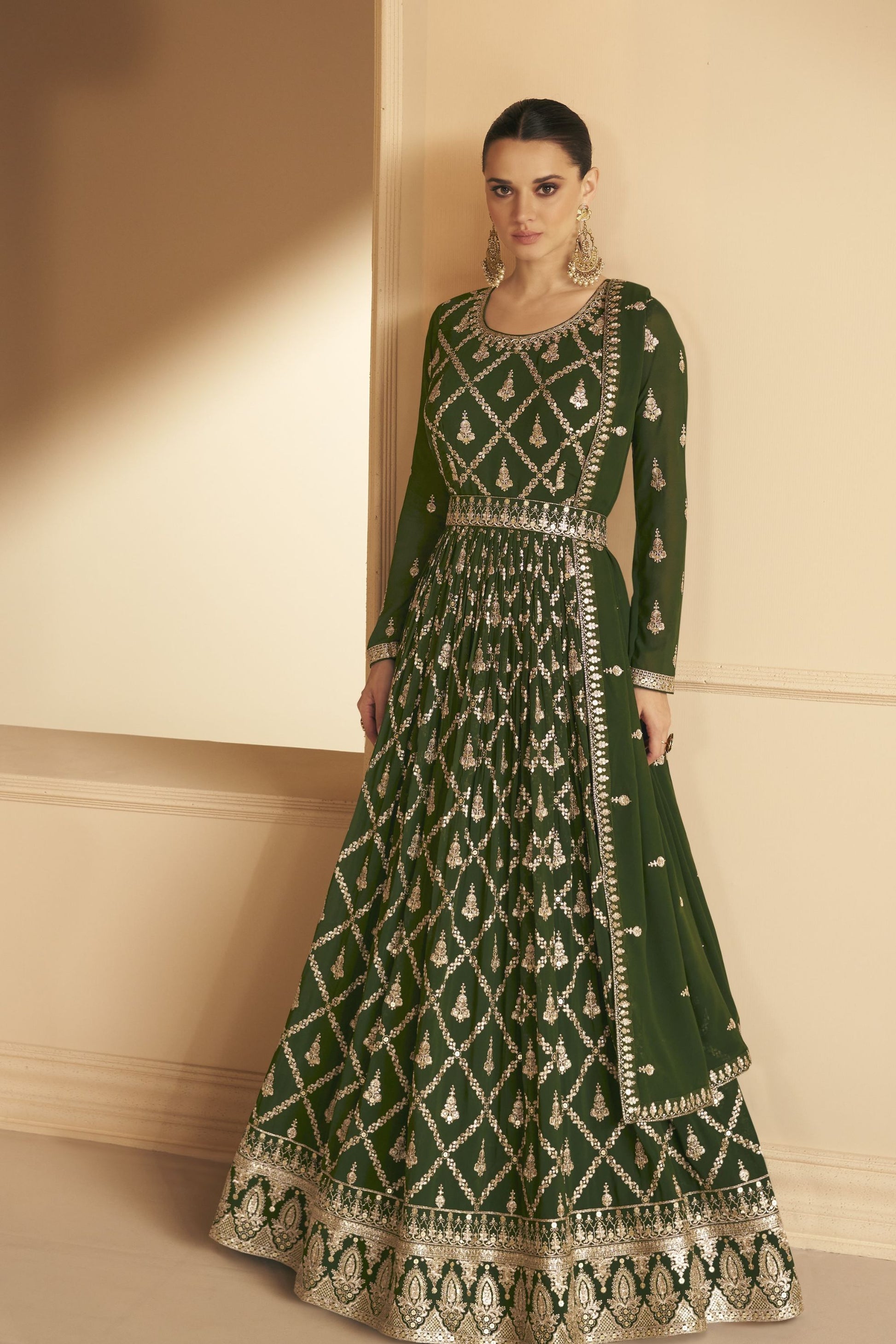 Expertly designed for festivals and weddings, this green georgette Anarkali gown showcases exquisite thread embroidery work. Elevate your style and make a statement with this stunning outfit, perfect for any special occasion. Crafted with precision and skill, it offers a timeless elegance with a touch of modern flair.