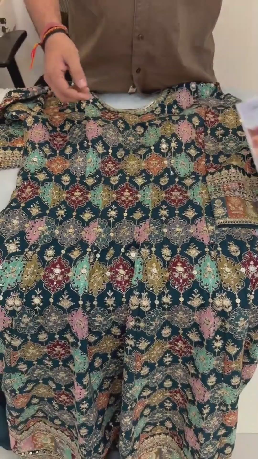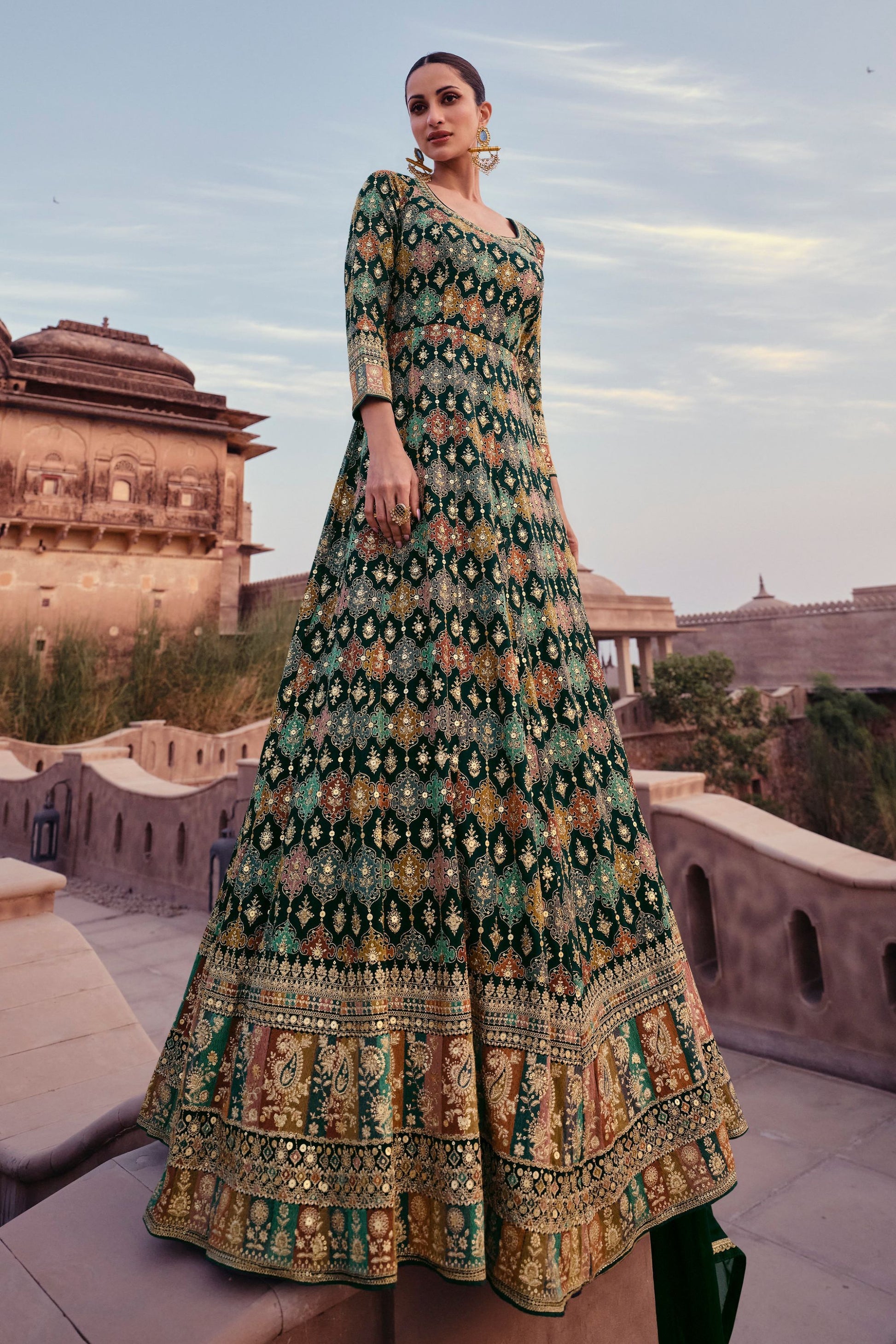 Expertly crafted for special occasions, this green georgette floor-length anarkali gown features intricate embroidery work, perfect for festivals and weddings. Showcase your style and elegance with this stunning piece.