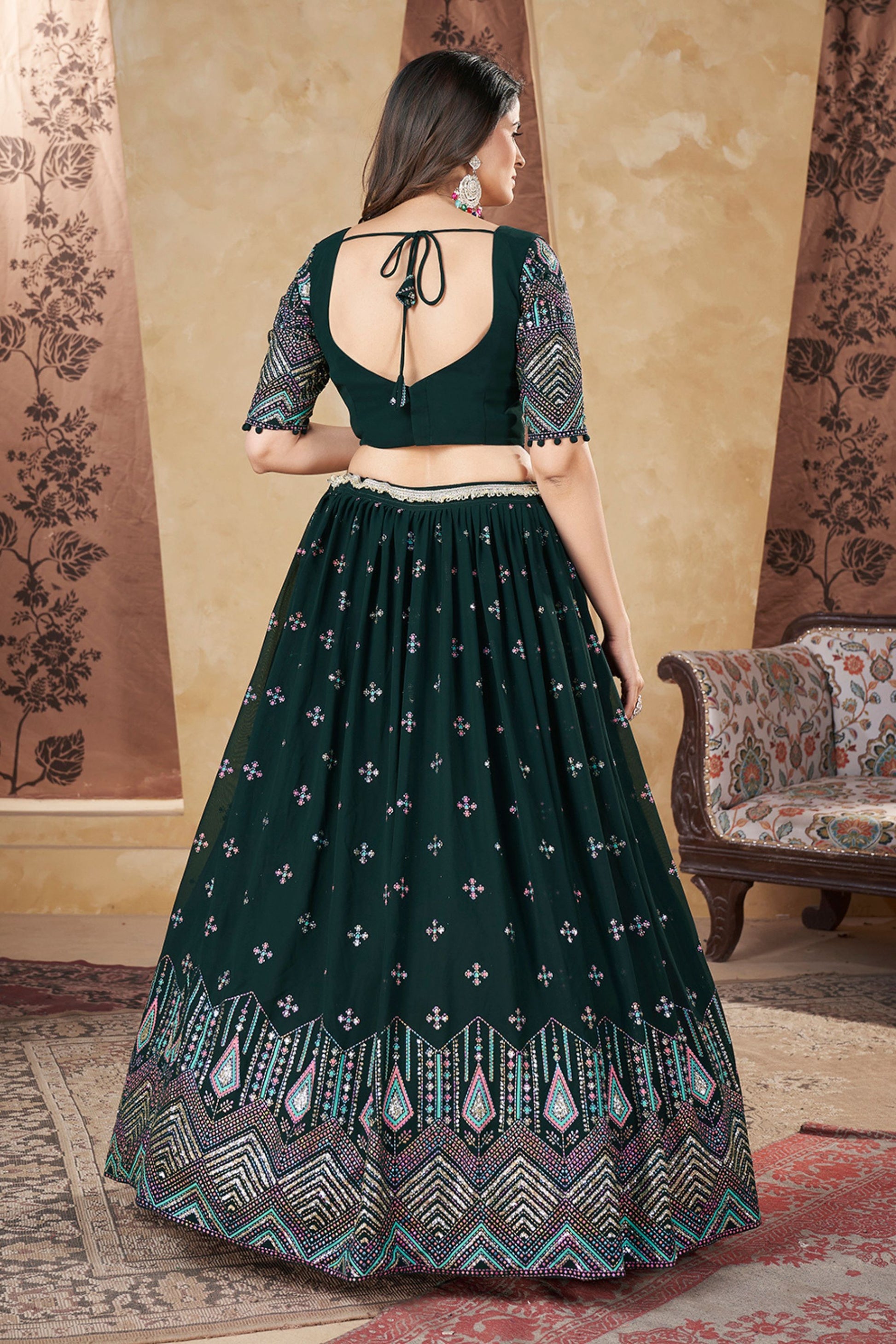 Green Georgette Lehenga Choli For Festivals & Weddings - Thread Embroidery Work, Foil Mirror Work