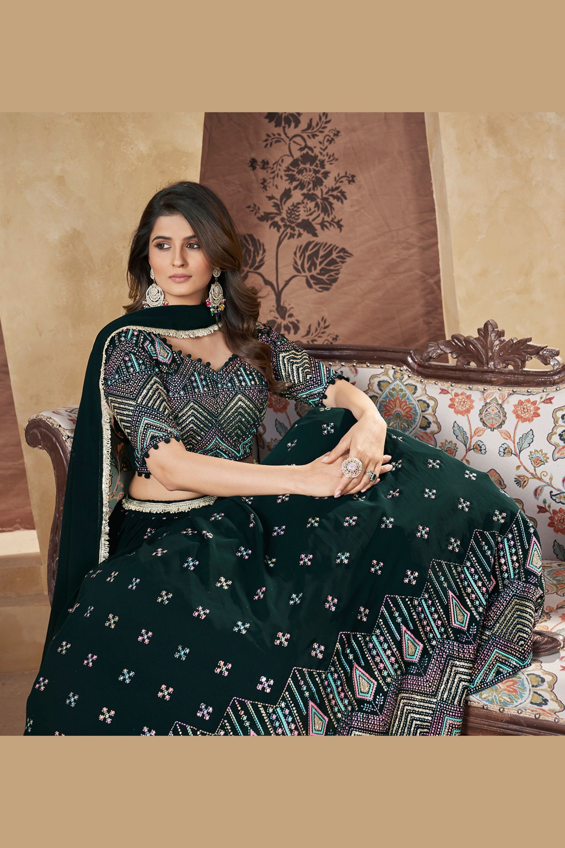 Get ready to turn heads at your next festival or wedding with our stunning Green Georgette Lehenga Choli. The intricate Thread Embroidery Work and shimmering Foil Mirror Work will add a touch of elegance to any occasion. Made with high-quality Georgette fabric, this piece is both stylish and comfortable.