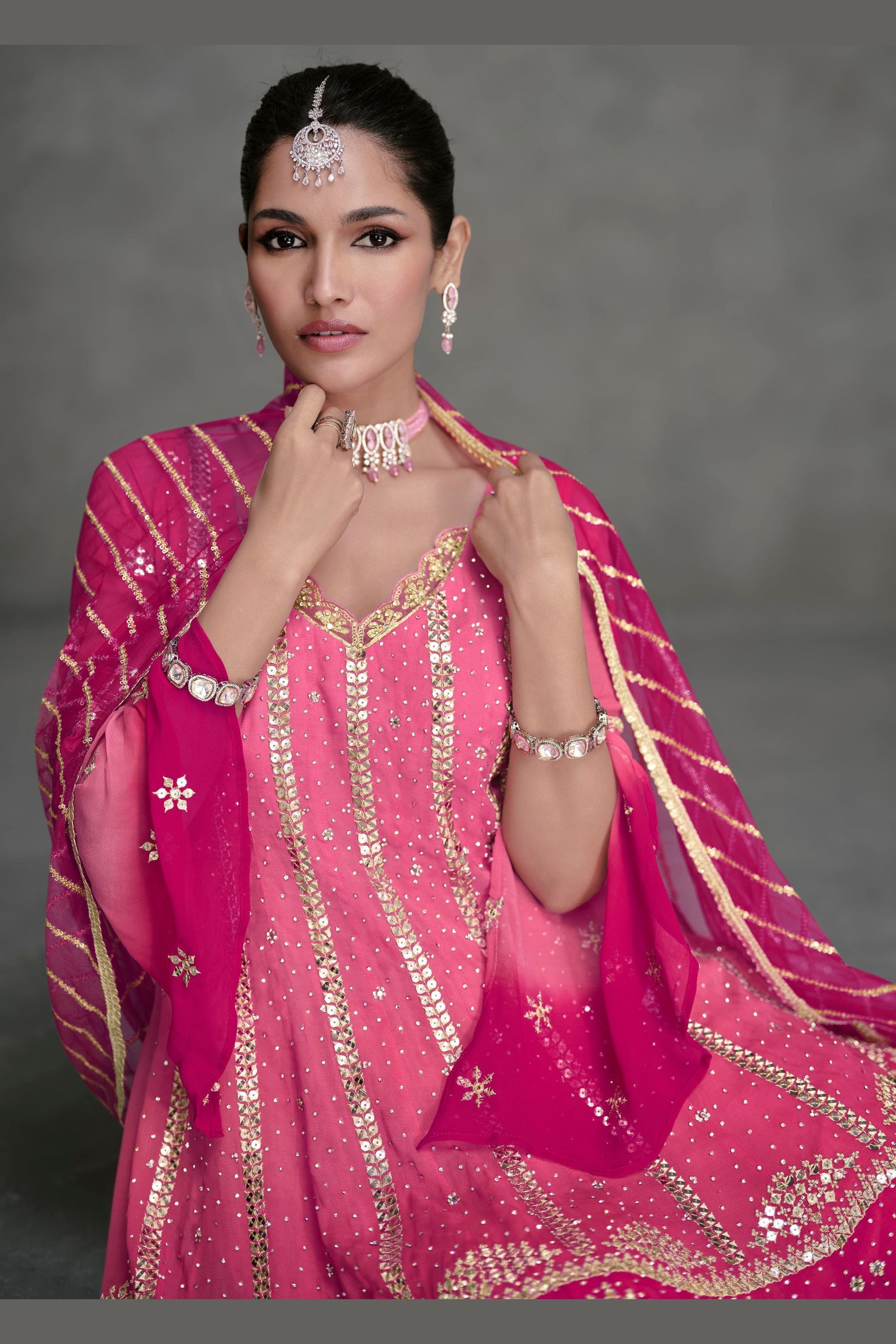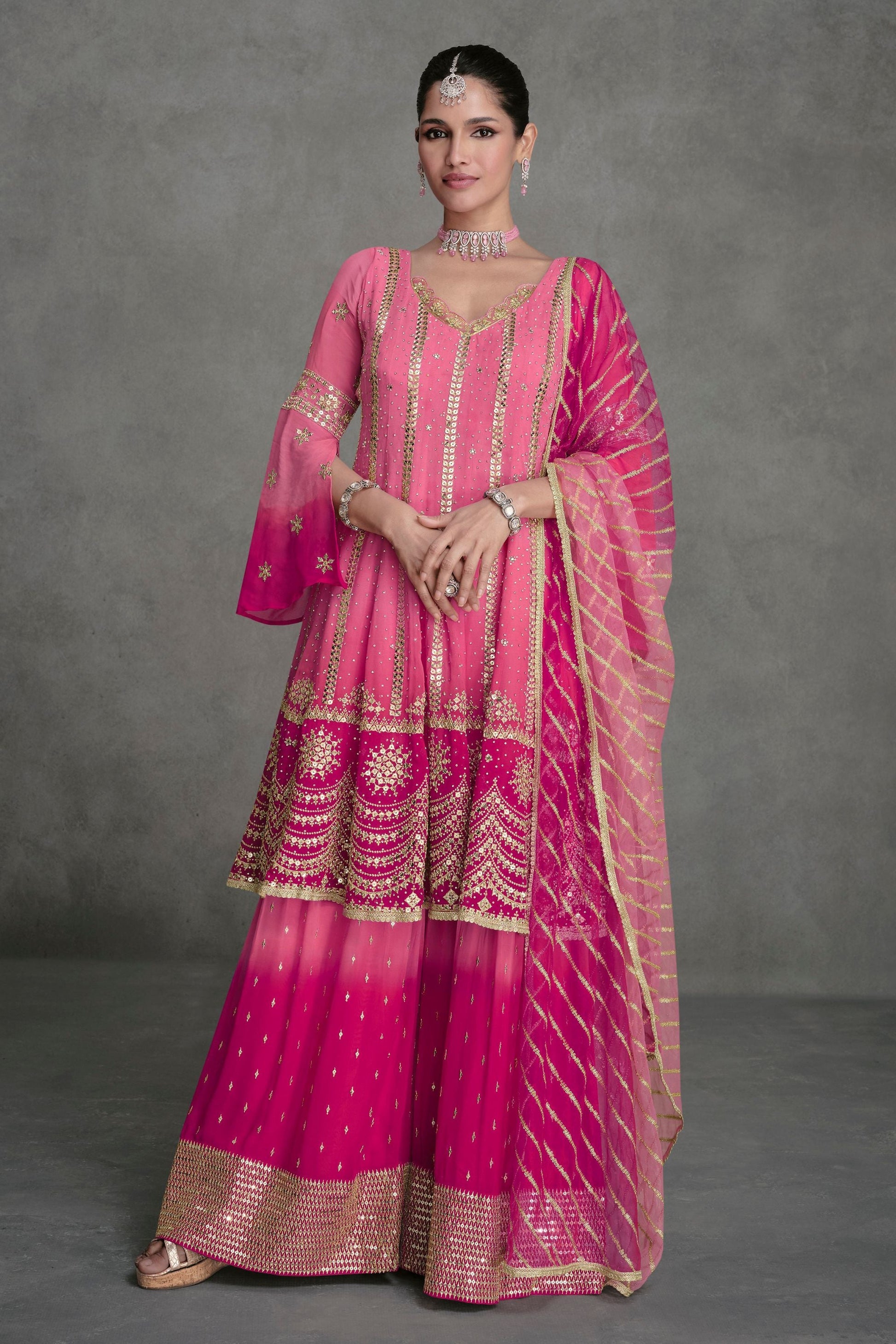 Pink Georgette Dual Tone Plazo Suit For Indian Festivals & Pakistani Weddings - Embroidery Work