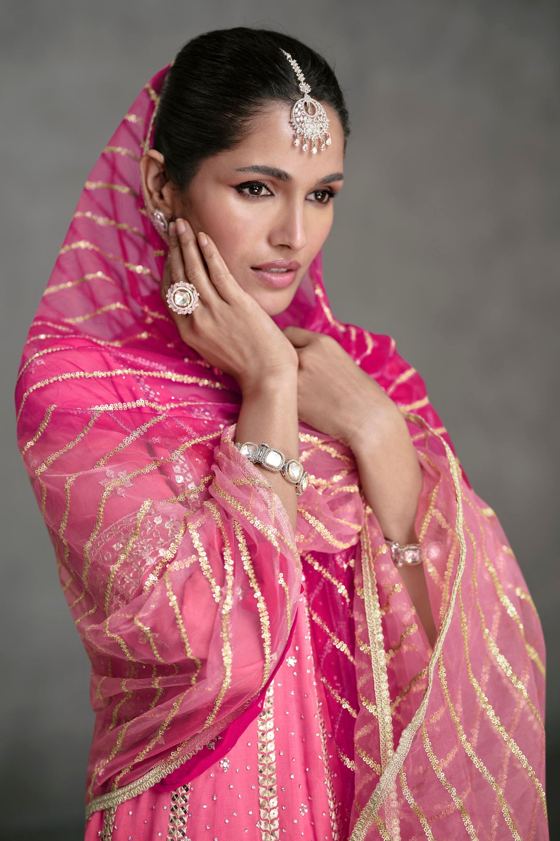 This elegant pink Georgette dual tone plazo suit is perfect for both Indian festivals and Pakistani weddings. The intricate embroidery work adds a touch of grace and sophistication to this outfit. Made with high-quality fabric, it offers both comfort and style. Elevate your traditional attire with this beautiful suit.