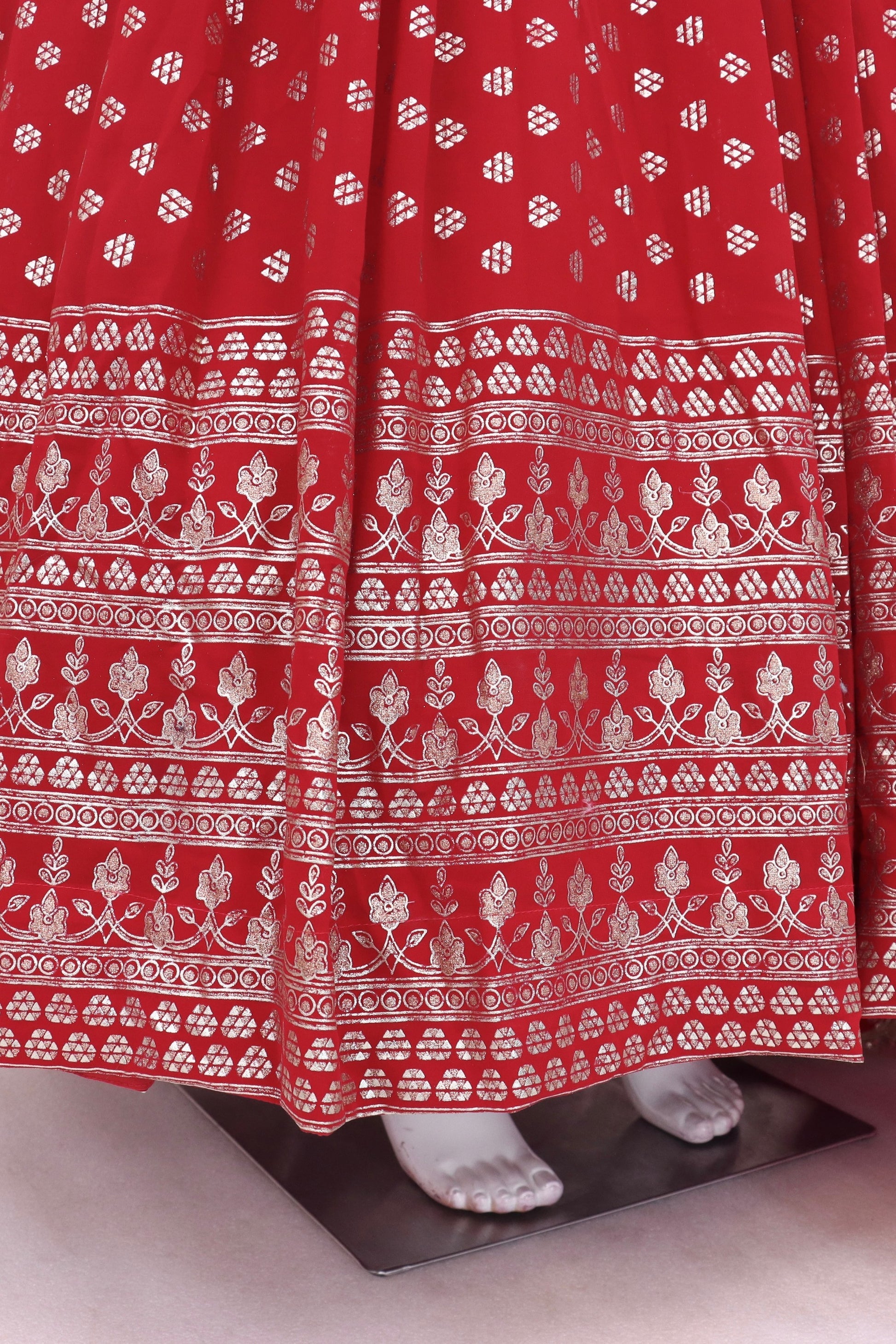 Red Georgette Full Length Anarkali Suit For Festivals & Weddings - Metallic Foil Work