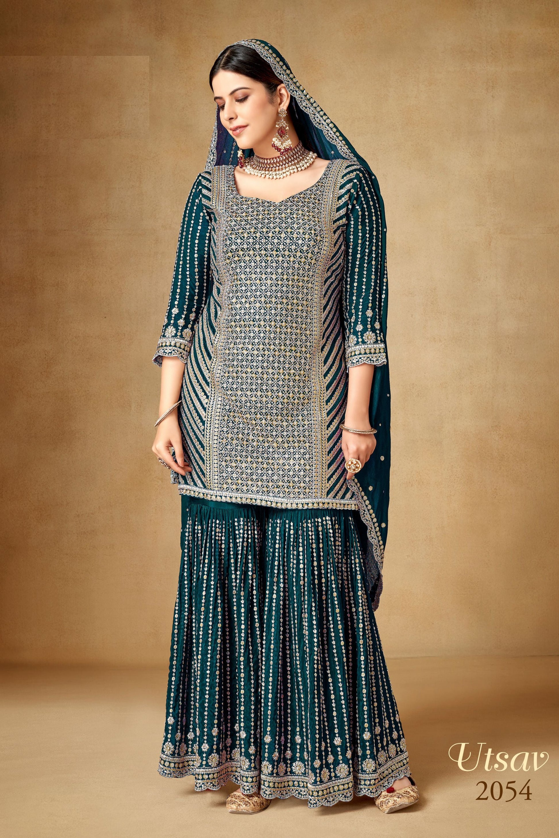 Teal Chinon Silk Sharara Suit - Sequence Embroidery Work, Zari Work