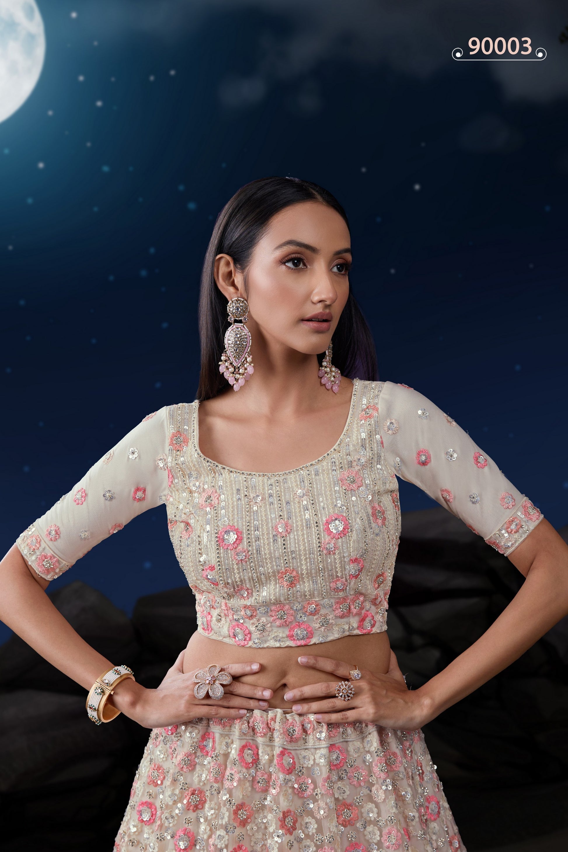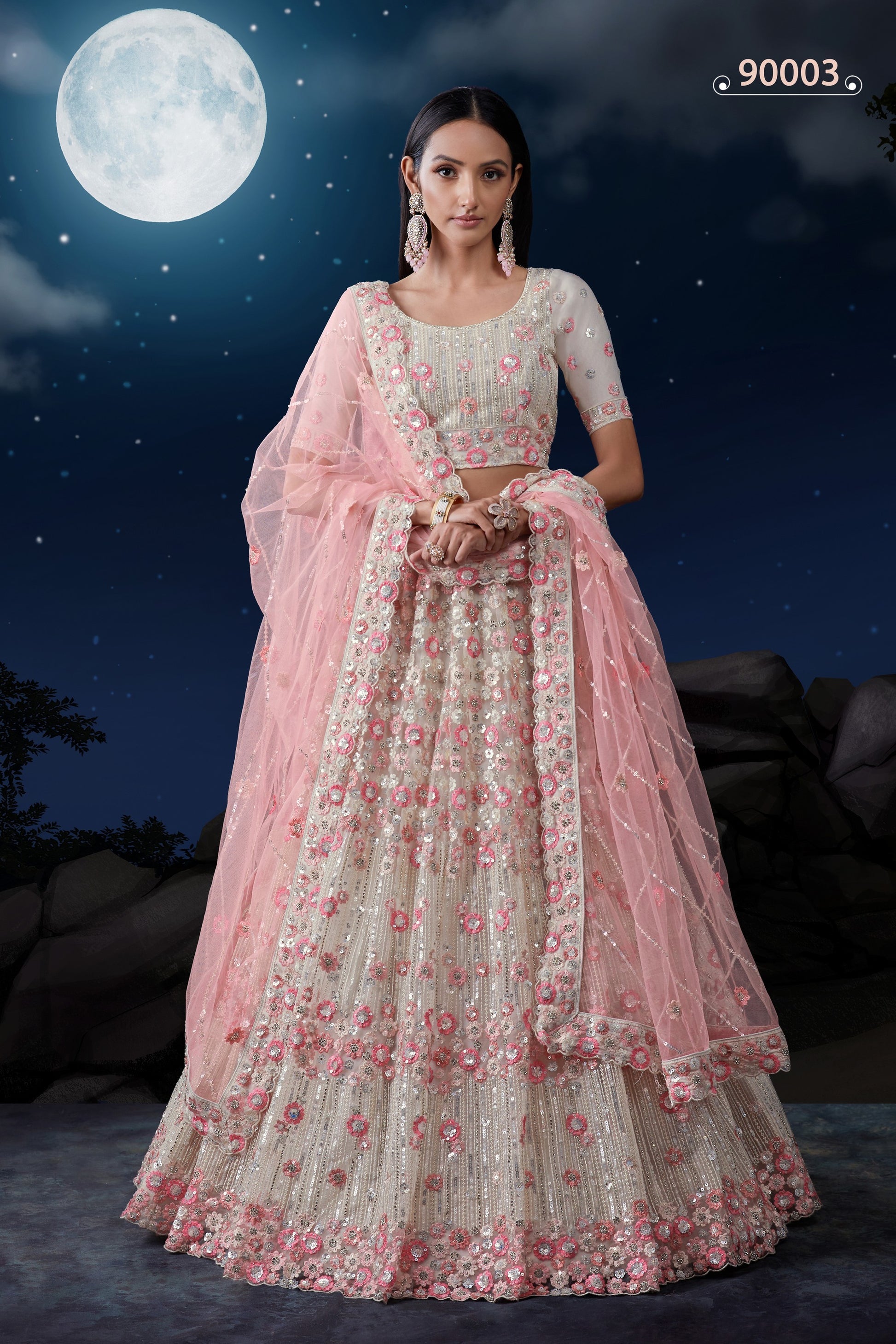 White Net Lehenga Choli For Festivals & Weddings - Sequence Embroidery Work, Zarkan Work, Thread Embroidery Work