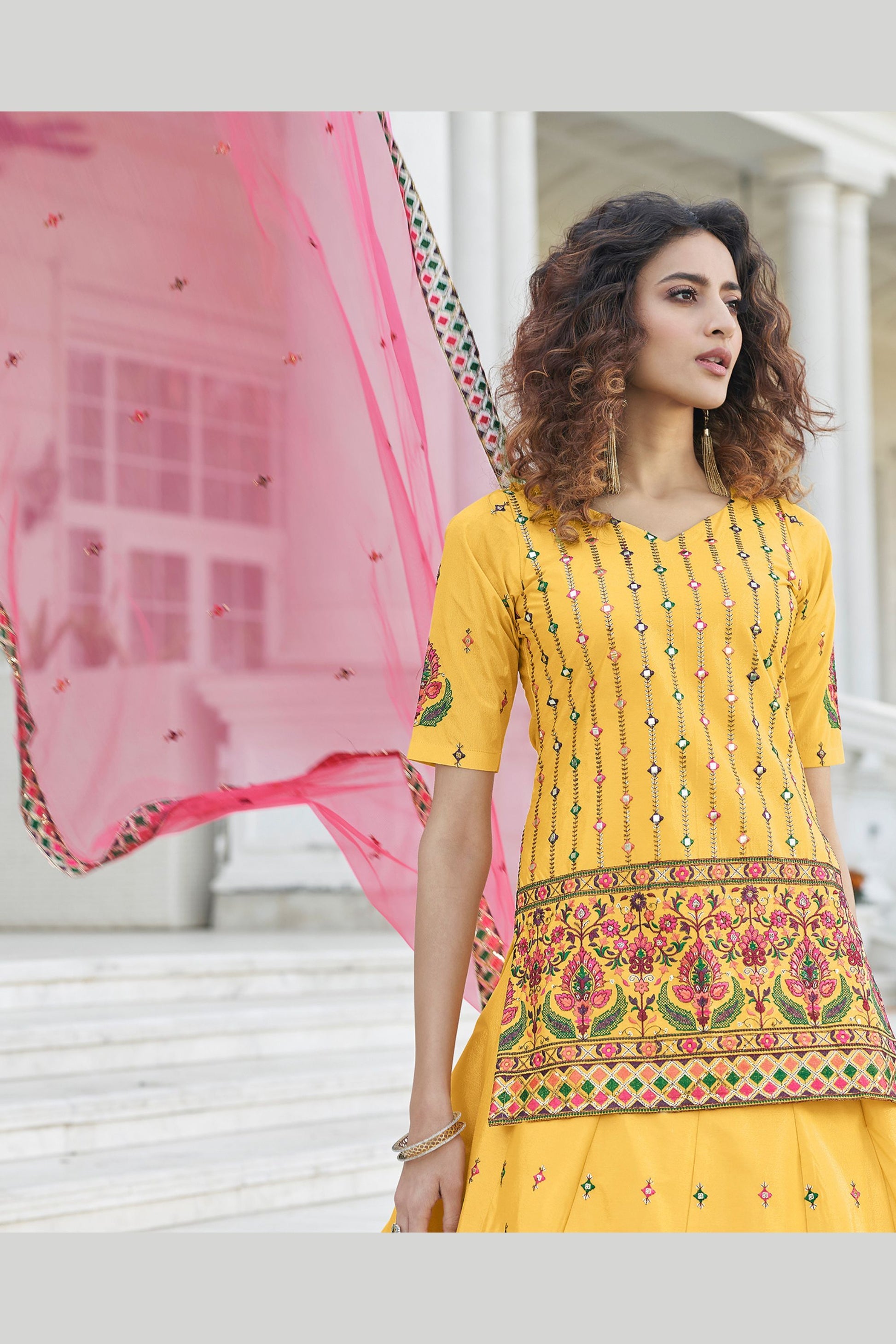 Elevate your style with our Yellow Chinon Lehenga Choli. Perfect for festivals and weddings, it features exquisite sequence and thread embroidery work. Stand out in the crowd with this elegant and unique piece.