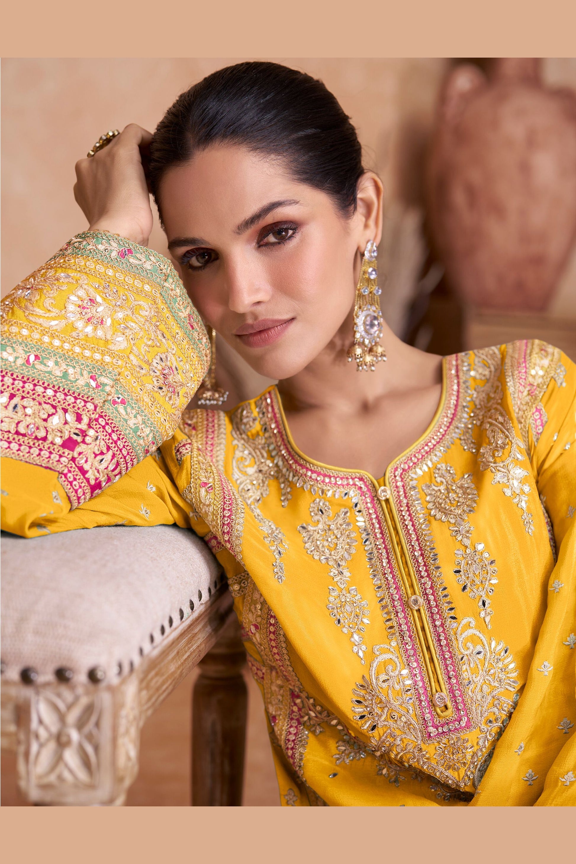 This yellow Chinon Plazo Suit is the perfect choice for Indian festivals and weddings. Its intricate embroidery work adds a touch of elegance and sophistication, making you stand out in any occasion. Made with high-quality materials, this suit offers both style and comfort. Elevate your wardrobe with this must-have piece.